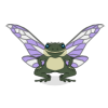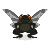 These frogs have medium antennae, medium blue eyes, a small nostril gap, a medium vocal sac, large persimmon and reddish-purple wings, a swamp green body with a peach belly, and purple freckles. Sherbet Flower Frogs are caretakers of the natural world, especially flowers. They are known to bring good luck, happiness, and prosperity to those whose gardens they inhabit.